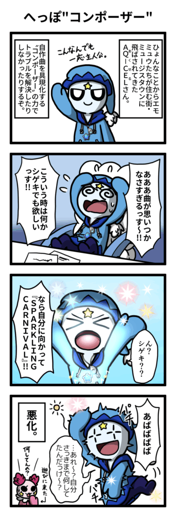あくせるさんは、ミュージスタウンで曲を作る日々を過ごしています。これは、「一曲作るごとに給料もらう」ととあるエモミュウと契約を交わしているからです。