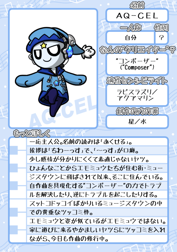 星座がモチーフの音符と、天の川と流れ星がモチーフの五線譜で、あくせるさんはこれらを総称して”アクアセレスコア(Aqua-CeleScore)”と呼んでいます。