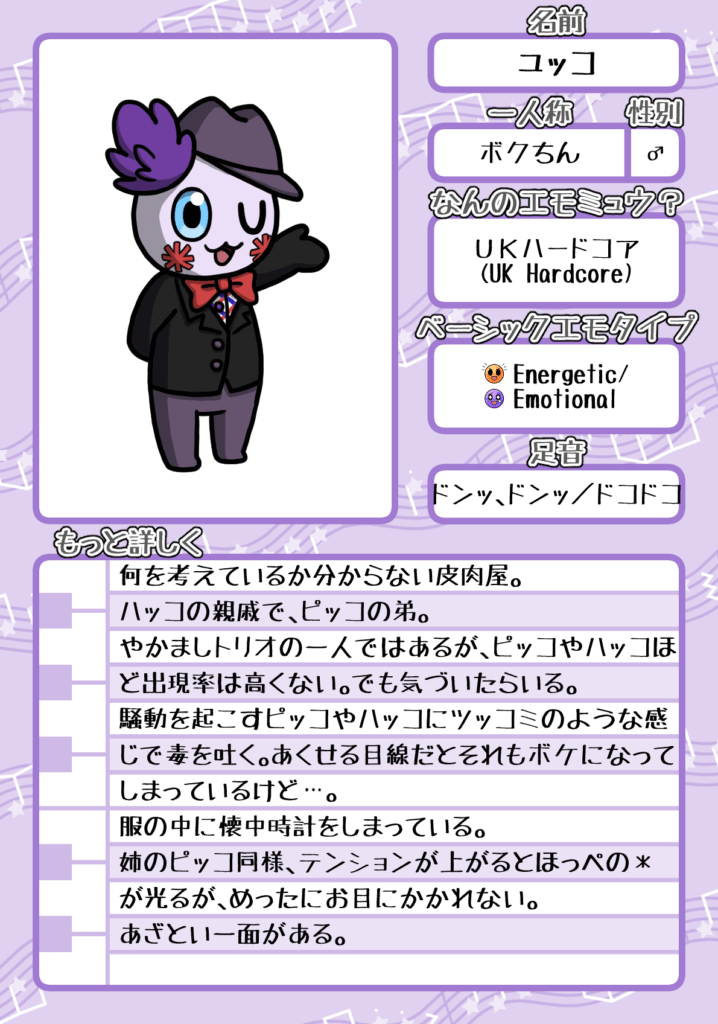 No.003 ユッコ(UKハードコア) 2025.09.21 トップページ > オリジナル作品 > EMOTIONAL♪MUSIC > キャラクター > No.003 ユッコ(UKハードコア) No.003 ユッコ(UKハードコア) ※分からない用語があったらこちらのページを見てみてね。書いてあるかも。 はみだしインフォメーション ただいま工事中!もうちょっと待ってね!